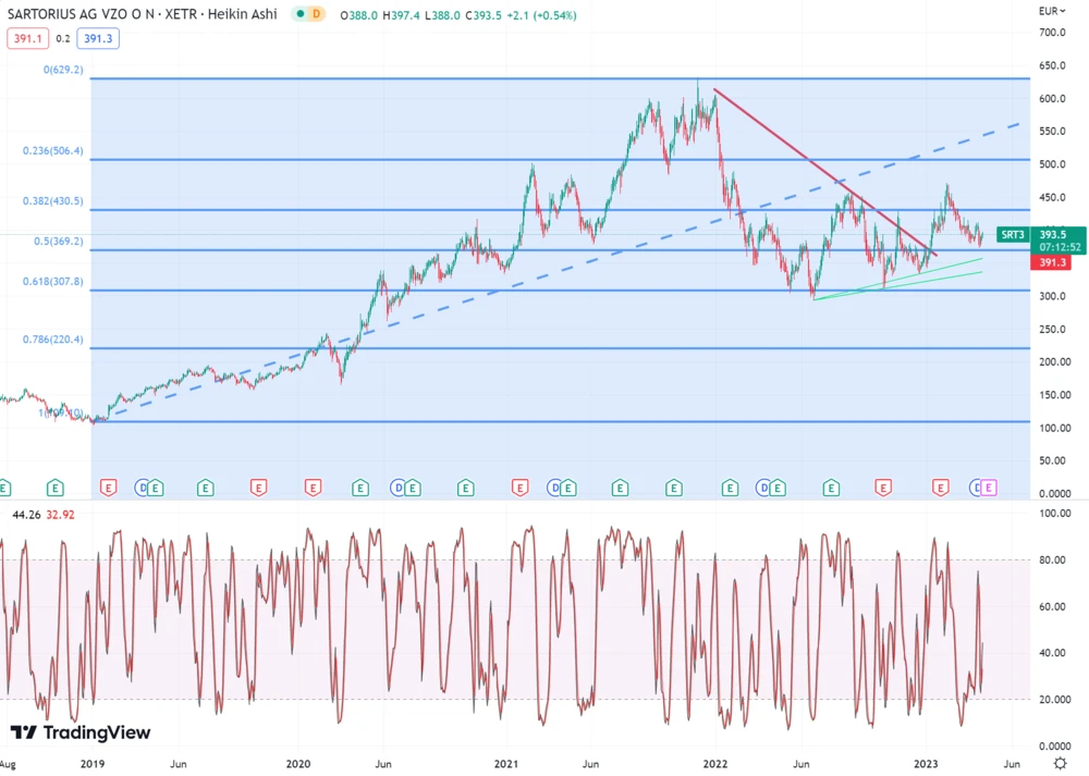 Sartorius hatte vor drei Monaten den von Dezember 2021 bis Januar 2023 aktiven Abwärtstrend verlassen und im Anschluss um 27 Prozent auf 472 Euro zugelegt. Dieses Niveau konnte Sartorius aber nicht halten.