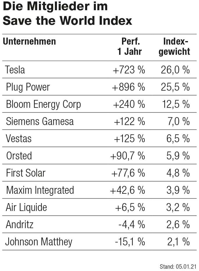 Der Aktienkurs von Plug Power hat sich im vergangenen Jahr vervielfacht und gehört zu den Zugpferden im Save the World Index. Die Zeichen stehen gut, dass das Papier auch 2021 zu den Outperformern an der Börse gehört. Denn in vielen Ländern werden die Regierungen immer klimafreundlicher und somit hagelt es neue Aufträge. Positiv auf die Aktie ausgewirkt haben sich zudem Steuervergünstigungen in den USA für zahlreiche klimafreundliche Technologien. Die Entwicklung, gerade was Brennstoffzellen angeht, ist erst am Anfang. Und Plug Power ist hier ein Pionier.