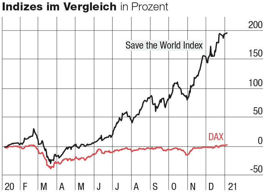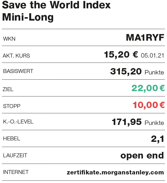 Am Ende war 2020 trotz Corona für die Börsen ein gutes Jahr. Der Leitindex DAX schaffte zwar nur 3,5 Prozent, dafür liefen verschiedene Einzelaktien deutlich besser. Trotzdem konnten die meisten nicht mit dem Save the World Index mithalten. Dieser legte mit fast 200 Prozent eine Top-Performance aufs Parkett. Seit dem Tief im März bei 77,38 Punkten startete der erst Ende 2019 aufgelegte Index durch und spurtete nun zu Jahresbeginn bis auf 316 Punkte. Das Allzeithoch bei 326,67 Zählern dürfte sehr bald wieder in Angriff genommen werden. Aufgrund des positiven Sentiments für die Umweltschutzthemen spricht in diesem Jahr viel für eine Fortsetzung der Rallye.
