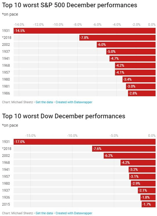 Weihnachten 2017 hatten die US-Anleger einigen Grund zur Freude. Die Kurse steigen im Schlussmonat um weitere 1,9 Prozent und krönten damit ein nahezu perfektes Aktienjahr. Völlig anders die Situation in diesem Winter: Dow Jones und S&P 500 steuern auf den größten Monatsverlust seit der Großen Depression im Jahr 1931 zu.