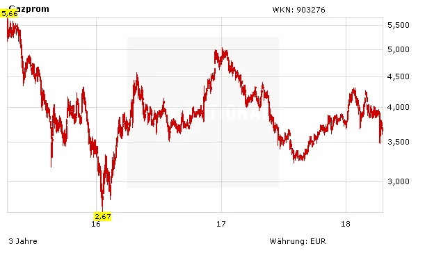 Ein derartiges Verhältnis gibt es normalerweise nur bei Unternehmen, die in wirtschaftliche Schieflage geraten sind. Doch bei Gazprom rollt der Rubel auch 2018 weiter. So dürfte das operative Ergebnis (EBITDA) im laufenden Jahr von 26 auf fast 29 Milliarden Dollar steigen, der Nettogewinn um knapp 15 Prozent auf 14,5 Milliarden Dollar.
