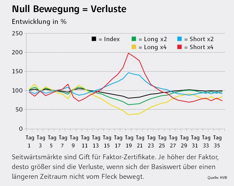 Zeichnet sich wider Erwarten ein Seitwärtstrend ab, sollten Anleger ihr Engagement in einem Faktor-Zertifikat gegebenenfalls noch einmal überdenken. Diese Produkte haben keine Laufzeitbegrenzung und der Ein- sowie Ausstieg ist jederzeit möglich.