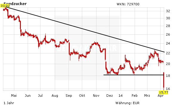 Die Marktteilnehmer reagieren geschockt auf die bittere Überraschung. Nachdem die Südzucker-Aktie bereits über acht Prozent unter ihrem Vortagesschlusskurs eröffnete, verlor der MDAX-Titel im Handelsverlauf nochmals rund zwölf Prozent an Wert. Im Zuge des Kurssturzes rauschte die Aktie durch die horizontale Unterstützung bei 18 Euro. Anleger lassen die Finger von der Aktie und greifen nicht in fallende Messer.