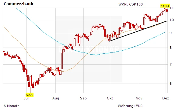 Nach der Rallye der Commerzbank-Aktie steigt die Gefahr einer Korrektur. Aktionäre sollten ihre Position halten, aber mit einem engen Stoppkurs absichern. Noch ist der Aufwärtstrend jedoch intakt. Erst bei Kursen unter 10 Euro würde sich das Chartbild deutlich eintrüben.