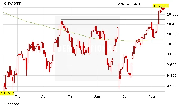 DER AKTIONÄR hatte bei 10.190 Punkten zum Einstieg auf der Long-Seite geraten. Der Schein mit der WKN DGH1CM liegt mittlerweile knapp 60 Prozent vorne. Der Stoppkurs wurde in der Zwischenzeit auf 11,50 Euro (circa 10.470 Zähler) nachgezogen.