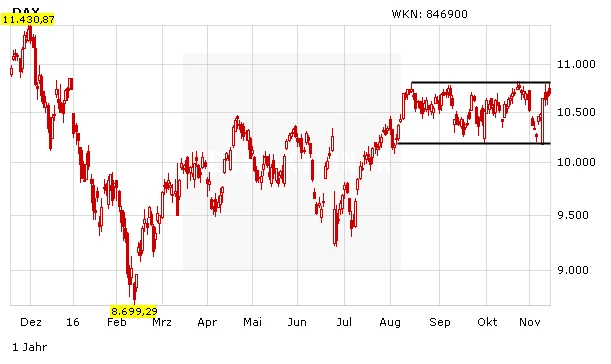Noch ist das bisherige Jahreshoch von 10.828 Punkten in Schlagdistanz, Ausbruch und Rallye Richtung 11.400 Zähler bleiben möglich. Würde der Index aber erneut deutlich unter 10.600 Zähler abkippen, besteht die Gefahr eines vierten Tops und damit eines Rücksetzers an den unteren Rand der seit August gültigen Range zwischen 10.200 und 10.800. DER AKTIONÄR bleibt im Schein mit der WKN DGH1JE investiert. Der Stoppkurs bleibt bei 10,30 Euro.