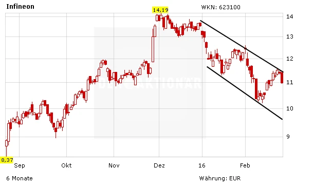 Trotz der guten fundamentalen Aussichten bleibt die Aktie im kurzfristigen Abwärtstrend gefangen. Im schlimmsten Fall droht ein Rücksetzer bis in einstellige Kursregionen. Erst mit dem Sprung aus dem Abwärtstrend würde sich das Chartbild wieder aufhellen. Ein Stopp bei 9,80 Euro kanpp unter dem Abwärtstrend sichert die Position ab.