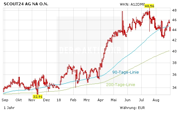 Für die Aktie des Unternehmens geht es in Folge des Führungschaos in der Spitze bis zu sieben Prozent nach unten. Kurzfristig scheint die Luft raus zu sein, mittel- bzw. langfristig bleibt der Internetportal-Anbieter aber dennoch interessant. Investierte Anleger setzten vorsichtshalber einen Stopp bei 35,00 Euro. Neueinsteiger verharren zunächst an der Seitenlinie und setzten Scout24 auf die Watchlist.