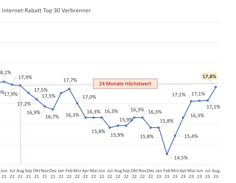 Nicht nur Elektroautos spüren den Marktgegenwind. „Mit 17,8 Prozent Nachlass haben die Top 30 Verbrenner einen 24 Monatshöchstwert erreicht. Und die Aussichten, dass der Trend in den nächsten Monaten gebrochen wird sind eher schlecht. Die wirtschaftlichen Daten in Deutschland sind wenig erfreulich, Kaufzurückhaltung prägt das Bild und die hohen Auftragsbestände zu Jahresbeginn sind „Schnee von gestern““, so Dudenhöffer.