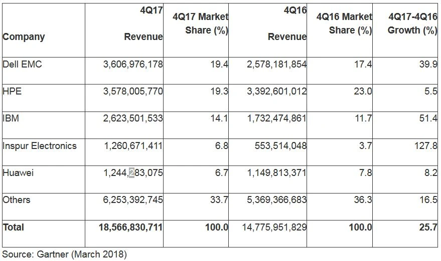 Der weltweite Servermarkt wuchs laut Gartner auch im vierten Quartal weiter an. Die Umsätze stiegen um 26 Prozent auf rund 18,6 Milliarden Dollar. Neben den Chinesen von Inspur konnten insbesondere die Server-Erlöse von IBM um 51 Prozent zulegen.