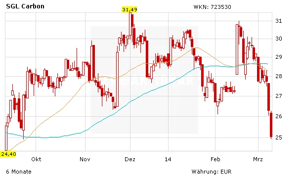 SGL Group haben am Dienstagnachmittag ihre Vortagesverluste ausgeweitet und sind am MDax-Ende um 4,46 Prozent auf 24,98 Euro gefallen. Kurz zuvor waren die Titel auf den tiefsten Stand seit September gesunken. Zu Wochenbeginn hatte der Kohlenstoffspezialist mitgeteilt, dass er nach einem dreistelligen Millionenverlust 2013 auch im laufenden Geschäftsjahr mit roten Zahlen rechne. Am Dienstag nun äußerten sich mehrere Analysten skeptisch zu den Aussichten für die Aktien. Analyst Johnson Imode von S&P Capital IQ etwa sah keine Verbesserungen in der Sparte Carbon Fibers & Composites