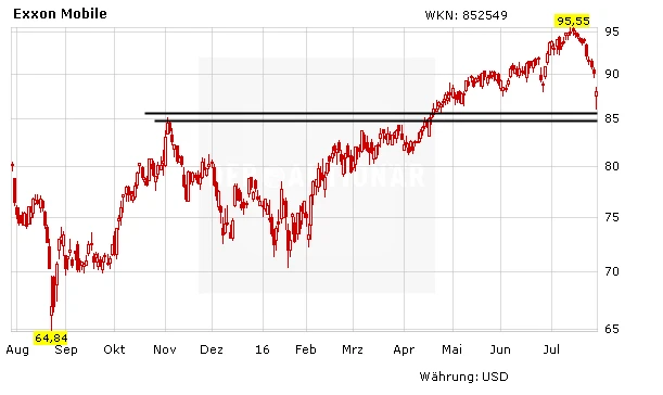 Aufgrund der hohen Dividendenrendite von knapp drei Prozent und einem für 2017 geschätzten KGV von 17 ist die Aktie von Exxon nicht unattraktiv. Das aktuelle Dreimonatstief beim Ölpreis setzt den Titel aber unter Druck. Solange keine nachhaltige Konjunkturbelebung eintritt und die hohen Lagerbestände beim Öl sinken, ist ein Neueinstieg nicht angebracht. Nach dem jüngsten Kursrückgang rückt die 200-Tage-Linie bei 83,28 Dollar in Sicht. Nach unten sicheren auch noch die horizontalen Unterstützungen bei 86,54 und 85 Dollar ab. Investierte Anleger bleiben dabei.