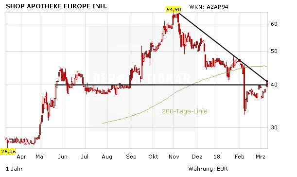 Gelingt der Umsatzsprung um 87 bis 97 Prozent, dürfte die Shop Apotheke 2018 einen Umsatz zwischen 530 und 560 Millionen Euro anpeilen. Zum Vergleich: An der Börse wird das Unternehmen mit gut 500 Millionen Euro bewertet – de facto nicht einmal der angepeilte Umsatz des laufenden Jahres. Angesichts der Wachstumsraten dürfte die Aktie sich wieder in Richtung der alten Höchstände arbeiten.