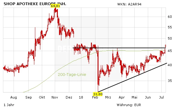 Erstmals seit dem GroKo-Schock im Januar notiert Aktie der Shop Apotheke Europe wieder höher. Mit dem nachhaltigen Ausbruch über den horizontalen Widerstand bei 45 Euro hat das Papier ein starkes Kaufsignal generiert. Investierte Anleger geben kein Stück aus der Hand.