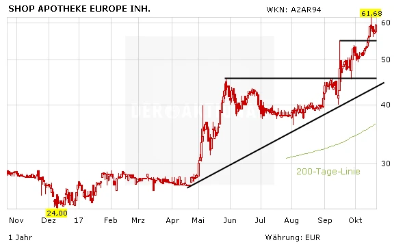 Mit einem Umsatzwachstum von satten 53 Prozent in den ersten neun Monaten des Geschäftsjahres 2017 bleibt die Shop Apotheke Europe klar auf Kurs. Im Abschlussquartal plant die Online-Apotheke das angeschlagene Wachstum weiter zu forcieren. Die starken Aussichten hat die Aktie in den letzten Wochen aber erst teilweise eingepreist.
