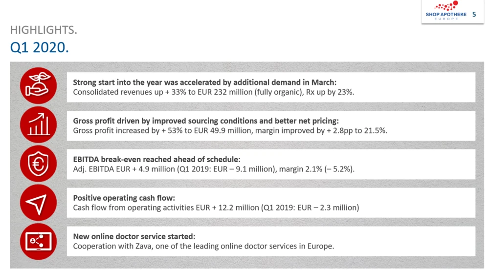 Im ersten Quartal 2020 zählte Shop Apotheke Europe insgesamt fünf Millionen aktive Kunden. Dem Vernehmen nach hat sich auch die Umsatzdynamik auch im April fortgesetzt, die Geschäftsentwicklung für 2020 liege über Plan. Dennoch: Eine vollständige Guidance will Shop Apotheke Europe erst mit der Vorlage der Halbjahreszahlen abgeben.