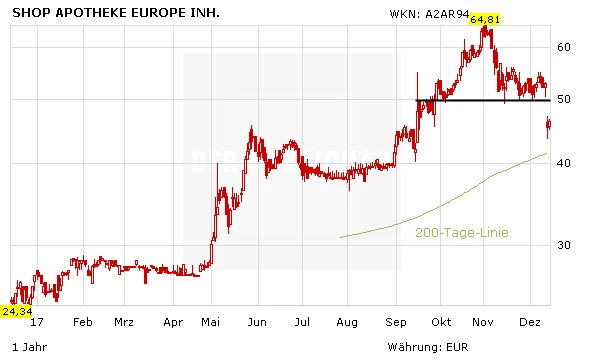 Hauptursache für den Druck ist allerdings der Verkauf von 806.000 Aktien der Shop Apotheke, 120.000 Stück davon vom CEO und Mitgründer Michael Köhler, sowie 686.000 durch ein Konsortium, die Aktien im Rahmen des IPO im vergangenen Jahr erhalten haben. Das berichtet die Nachrichtenagentur Bloomberg. Zu 46 Euro seien die Aktien platziert worden. Um diese Marke bewegen sich mittlerweile die Papiere der Shop Apotheke Europe und sollten die Talfahrt vorerst stoppen.