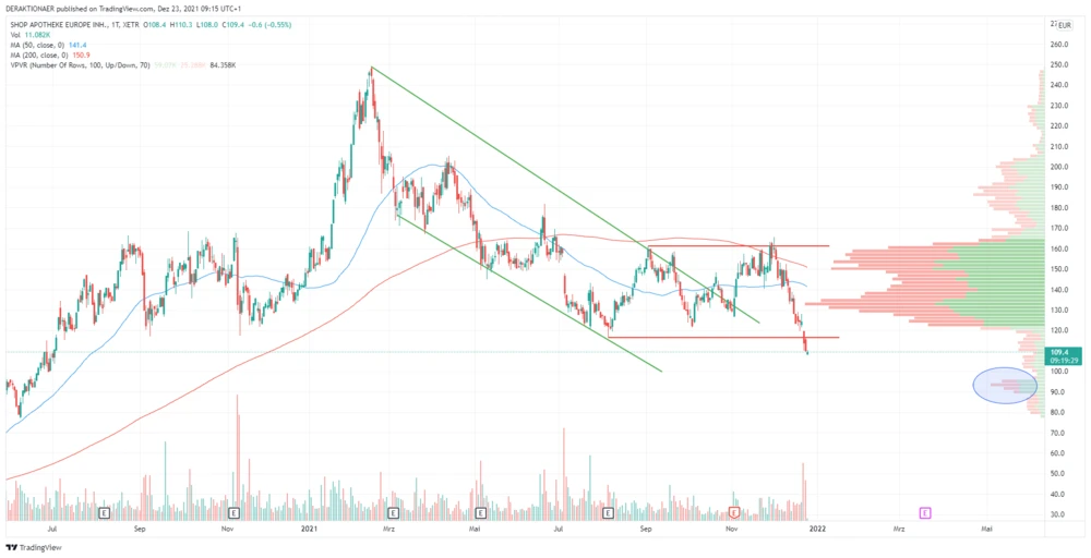 Nachdem sich die Shop-Apotheke-Aktie seit August innerhalb eines Seitwärtskanals zwischen 116 und 165 Euro bewegte, prallte sie zu Beginn des Monats an der oberen Begrenzung ab. Nach einer steilen Abwärtsbewegung fiel sie nun am Dienstag nachhaltig unter den Kanal und löste damit ein starkes Verkaufssignal aus. Weitere Rücksetzer bis an die 100-Euro-Marke sind nun recht wahrscheinlich. Darunter liegt die nächste Unterstützung am Volume-Peak bei 92 Euro.