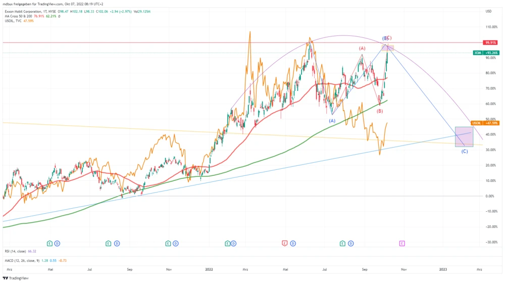Es ergeben sich somit zwei Möglichkeiten, um die langfristige Korrelation der beiden Werte wiederherzustellen. Entweder hat der Ölpreis massives Potenzial nach oben oder die Exxon-Aktie dieses nach unten. Aus charttechnischer Sicht ist das bearishe Szenario für Exxon zu favorisieren.