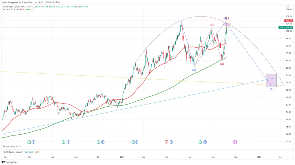 Nach dem steilen Abverkauf vom Allzeithoch im Juni bei 105,57 Dollar bis zum Tief im Juli bei 80,69 Dollar hat sich eine Gegenbewegung entwickelt, deren finale dritte Welle mit dem Überschreiten des Zwischenhochs bei 101,56 Dollar vor dem Abschluss stehen sollte. Von dort aus gibt es ein Abwärtspotenzial von circa 25 Prozent, das Ziel ist ein erneutes Anlaufen der Aufwärtstrendlinie, welche seit März 2020 intakt ist.