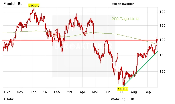 Während an der Zinsfront Ebbe herrscht, verwöhnt die Munich Re ihre Aktionäre mit einer stattlichen Dividende. Auch fundamental stimmt alles bei den Münchnern. Charttechnisch hat sich der kurzfristige Aufwärtstrend zuletzt noch beschleunigt und die Aktie ist über die 200-Tage-Linie ausgebrochen. Anleger greifen deshalb bei den Titeln zu und freuen sich über eine satte Rendite. Das Kursziel beträgt 180,00 Euro, ein Stopp wird bei 140,00 Euro platziert.