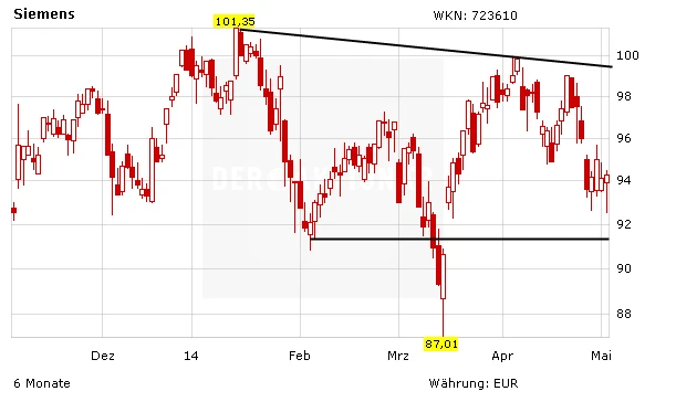 Ein Einstieg bei Siemens drängt sich derzeit nicht auf. Bevor die Konzernchef Käser keine konkreten Angaben zum Konzernumbau gemacht hat bleiben Anleger auf der Seitenlinie. Investierte Anleger behalten bei der Siemens-Aktie die horizontale Unterstützung bei knapp 93 Euro im Auge. Hier hat die Siemens-Aktie zuletzt wieder nach oben gedreht.
