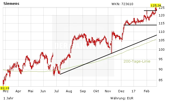 Die Stimmung bei Siemens ist derzeit glänzend. Nach der Anhebung der Prognose notiert die Aktie des Industriekonzerns nur knapp unterhalb des Allzeithochs bei 126,23 Euro. Der Ausbruch dürfte nur eine Frage der Zeit sein. Mit dem breiten Portfolio ist Siemens bestens positioniert. Fraglich bleibt lediglich, mit welcher Struktur CEO Joe Kaeser die Zukunft bestreiten will.