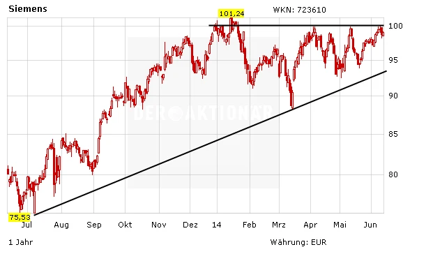 In letzter Zeit hat der Alstom-Poker die Schlagzeilen bestimmt. Doch der massive Umbau unter Joe Kaeser dürfte sich unabhängig von diesem Deal bald auszahlen. Die Siemens-Aktie dürfte bald wieder dreistellig notieren. DER AKTIONÄR ist vom Potenzial des Konzerns überzeugt und sieht das Kursziel bei 125 Euro.