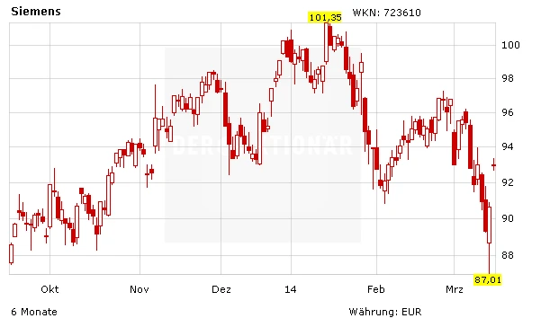Die Aktie des DAX-Konzerns Siemens legt zum Wochenstart mehr als zwei Prozent auf 92,98 Euro zu und führt damit klar die Gewinneraktie des deutschen Leitindexes an. Das Papier profitiert von zwei Analysten-Hochstufungen. Die US-Bank JPMorgan hat Siemens von 'Neutral' auf 'Overweight' hochgestuft und das Kursziel auf 102 Euro belassen. Die Aktie des Elektrokonzerns habe sich seit Jahresbeginn unterdurchschnittlich entwickelt und werde mit einem nahezu historischen Abschlag zum Sektor gehandelt, schrieb Analyst Andreas Willi zur Begründung der Heraufstufung in einer Studie vom Montag. Überdies hätten sich die Erwartungen an die nächste Konzernpräsentation Anfang Mai abgeschwächt, daher habe sich das Chance-Risiko-Profil der Siemens-Aktie verbessert.