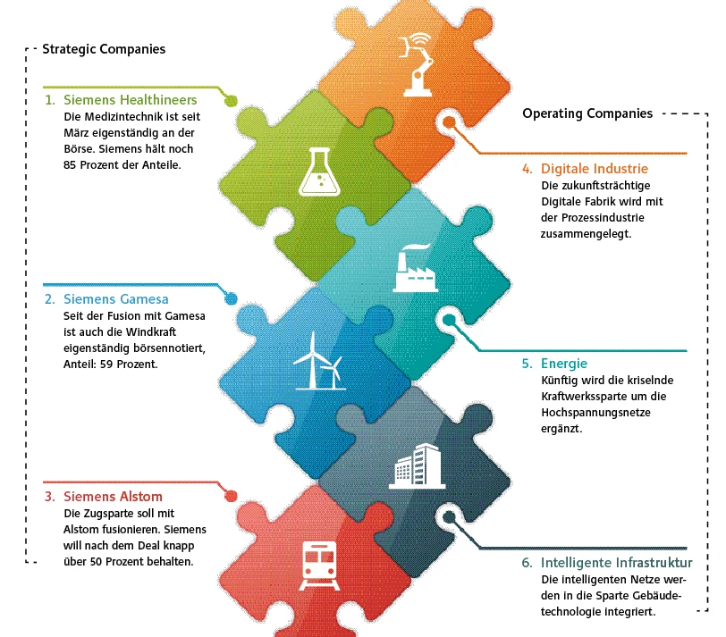 Die „Vision 2020+“ sieht vor, den einzelnen Bereichen mehr Eigenständigkeit zuzugestehen und neue Synergien zu schaffen. Statt wie bisher acht Geschäftsbereiche soll es künftig nur noch drei „Strategic Companies“ und drei „Operating Companies“ geben. Die Grafik zeigt, wie aus dem bisherigen Konglomerat die "neue Siemens" werden soll.