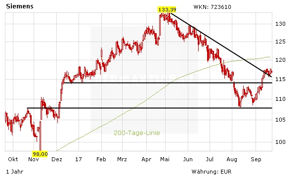Siemens ist auf dem richtigen Weg. Die Strategie von Konzernchef Joe Kaeser, einzelne Bereiche abzuspalten, ist wertschaffend. Auch beim Zuggeschäft macht eine Kooperation Sinn. Dank der starken Position bei der Industrie 4.0 und dem anstehenden Börsengang der lukrativen Medizintechniksparte Healthineers steht die Aktie vor weiteren Kursgewinnen. Nachdem die Konsolidierung abgeschlossen ist, geben Anleger kein Stück aus der Hand. Auch Neueinsteiger können noch zugreifen.
