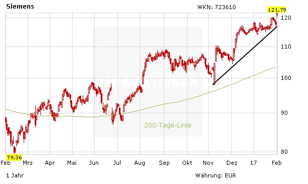 Mit einem deutlichen Kursplus führt die Siemens-Aktie den DAX an. Ein neues Mehrjahreshoch wurde erreicht, das Allzeithoch bei 126,23 Euro ist nicht mehr weit entfernt. Schwung liefern starke Zahlen zum ersten Quartal. Dank eines kräftigen Gewinnsprungs hat Konzernchef Joe Kaeser auch die Prognose für das Gesamtjahr angehoben.