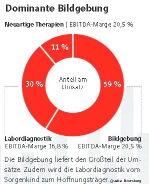 Siemens Healthineers ist bestens positioniert, um vom Branchenboom zu profitieren. Das Geschäft der Siemens-Tochter teilt sich in drei Bereiche – Bildgebung, Labordiagnostik und Neuartige Therapien. Mehr als die Hälfte des Umsatzes macht die Bildgebung, mit rund 30 Prozent Marktanteil ist Healthineers hier sehr stark aufgestellt. Der Clou: Mit einer EBITDA-Marge von über 20 Prozent sind MRT, Röntgen und Co gleichzeitig besonders renditestark.