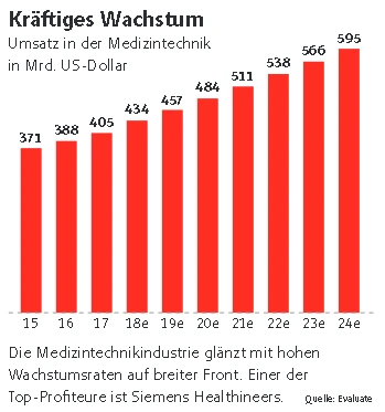 Selbst in der zuletzt hochvolatilen Phase des Gesamtmarkts hat sich Siemens Healthineers sehr stark präsentiert. Die Aktie, die inzwischen auch in den MDAX aufgestiegen ist, notiert lediglich fünf Prozent unter dem Allzeithoch. Doch die starke Entwicklung des Medizintechnikkonzerns kommt nicht von ungefähr. Allein die Branche ist hochattraktiv. Über 400 Milliarden Dollar sind im vergangenen Jahr bereits für Medizintechnik ausgegeben worden. Und die Tendenz ist klar steigend. Bis 2024 rechnen Experten mit einem jährlichen Wachstum von durchschnittlich 5,7 Prozent.