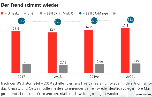 Sorgenkind war dagegen lange das Labordiagnostikgeschäft. Doch mit der neuen Plattform Atellica soll sich das Blatt wenden. Seit vergangenem Jahr wird das System weltweit eingeführt – und die Ziele wurden bislang erfüllt. 800 bis 1.000 Atellica-Systeme wollte Healthineers bis Ende September installieren, es wurden 999. Ende 2020 sollen bereits 7.000 Systeme installiert sein. Der Vorteil: Durch die Vereinheitlichung der Tests auf einer Plattform können Forschung und Entwicklung auf das Aushängeschild konzentriert werden. Trotz der großen Konkurrenz um Roche und Abbott soll Atellica so die großen Hoffnungen erfüllen. In den Zahlen macht sich das erst künftig bemerkbar. Bei der Labordiagnostik wird das große Geld nicht durch die Plattform selbst, sondern durch die Verbrauchsgegenstände verdient. Über 90 Prozent des Umsatzes machen die Reagenzien – umso wichtiger ist es, dass Healthineers bei der Installation von Atellica jetzt entscheidende Fortschritte vorweisen kann.