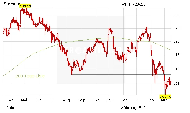 Die Siemens-Aktie ist im volatilen Marktumfeld zuletzt unter Druck geraten. Durch den Börsengang der Tochter könnte es nun aber neue Impulse geben. Eine Neubewertung des Industriegeschäfts ist künftig vonnöten. Aufgrund des schwachen Chartbilds warten Neueinsteiger allerdings vorerst ab. Wer investiert ist, beachtet den Stopp bei 100 Euro. Die Tochter Healthineers dürfte derweil nach dem Börsengang einen Blick wert sein.