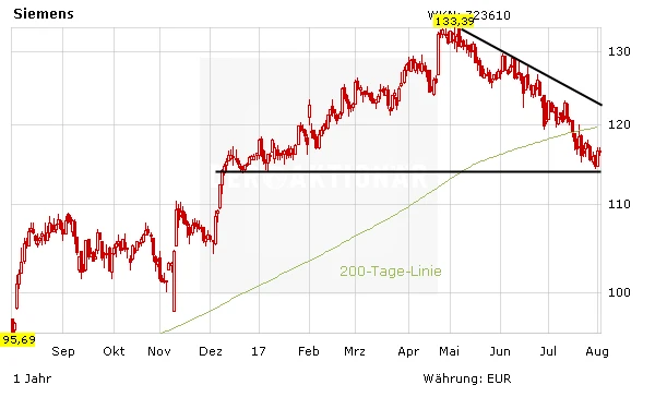 Siemens will sich bereits längere Zeit von seiner Mobilitätssparte trennen. Die Fusion mit Bombardier passt zudem in die Strategie von Vorstandschef Joe Kaeser, der immer mehr Sparten aus dem Konzerngeflecht herauslöst, um Werte zu heben. Das schwache Chartbild und die angeschlagene Tochter Siemens Gamesa belasten zwar. Langfristig bleibt die Aktie dank der starken Position bei der Industrie 4.0 aber sehr aussichtsreich. Neueinsteiger warten die Trendwende ab, investierte Anleger bleiben an Bord.