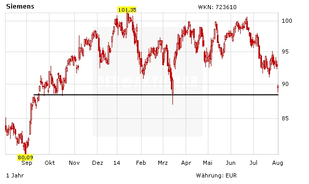 Joe Kaser treibt den Konzernumbau weiter voran. Siemens scheint also gut gerüstet für die Zukunft. Im schwachen Marktumfeld ist zuletzt jedoch auch die DAX-Aktie unter Druck geraten. Der Titel notiert knapp oberhalb der wichtigen Unterstützung bei rund 88 Euro. Vor einem Neueinstieg sollten Anleger allerdings ohnehin eine Aufhellung der aktuellen Lage abwarten.