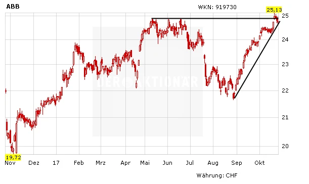 Der Schweizer Industriekonzern ABB hat im dritten Quartal die Auftragsflaute überwunden. 2017 bleibt für den Siemens-Rivalen zwar ein Übergangsjahr. Der Umbau unter Konzernchef Ulrich Spiesshofer scheint sich aber zunehmend auszuzahlen. Auch der Chart spielt mit: In Schweizer Franken hat die Aktie in dieser Woche bereits ein neues Mehrjahreshoch erreicht.