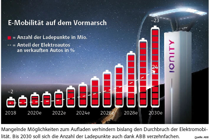 Neben dem Geld geht es bei ABB auch um Visionen und den Anspruch, die Welt zu verändern. 7.000 umweltfreundliche Ladestationen haben die Schweizer bereits installiert, was seit 2015 zweistellige Wachstumsraten ermöglicht. Und die Zukunft ist rosig. Die Anzahl der Schnelllader wird sich bis 2030 vervielfachen und Marktführer ABB auch dank der Kooperation mit Electrify America – als Ladenetz-Investor das Pendant zur deutschen Ionity – großen Anteil daran haben.