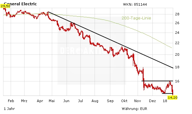 GE muss beweisen, dass der Turnaround gelingt. Aktuell sollten Anleger nicht in das fallende Messer greifen. Charttechnisch bleibt die Aktie angeschlagen, ein neues Mehrjahrestief droht. Vor den Zahlen, die am 24. Januar präsentiert werden, sollte der Dow-Titel in jedem Fall gemieden werden. Tritt operativ nachhaltig Besserung ein, könnte der Fallen Angel aber wieder attraktiv werden – immerhin erwirtschaftet GE nach wie vor Milliardengewinne.
