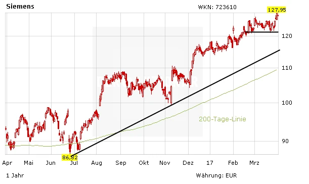 Dies dürfte auch der Siemens-Aktie langfristig Auftrieb verleihen. Im gestrigen Xetra-Handel markierte der DAX-Titel bei 127,95 Euro ein neues Allzeithoch. Anleger setzen auf die Fortsetzung der Rallye und bleiben an Bord. Das Kursziel lautet 150,00 Euro.
