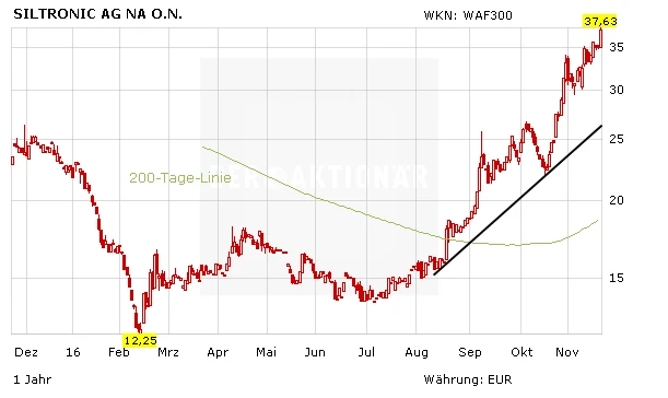 Das aufgehellte Marktumfeld hat zuletzt bereits diverse Analysten dazu veranlasst, ihre Prognosen für Siltronic anzuheben. Zudem hat der Konzern Ende Oktober starke Zahlen präsentiert. Ein weiterer Kurstreiber: Nach der jüngsten Übernahmewelle in der Branche herrscht auch bei Siltronic die Fantasie, dass es ein finanzkräftiges Angebot gibt.