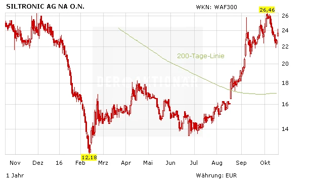 Der Markt preist bereits eine mögliche Übernahme von Siltronic ein. Gemessen am Allzeittief vom Februar konnten die Papiere in den Folgemonaten in der Spitze rund 50 Prozent zulegen. Zudem bessern sich die Fundamentaldaten – bei einem nachlassenden Preisdruck könnte der Turnaround gelingen.