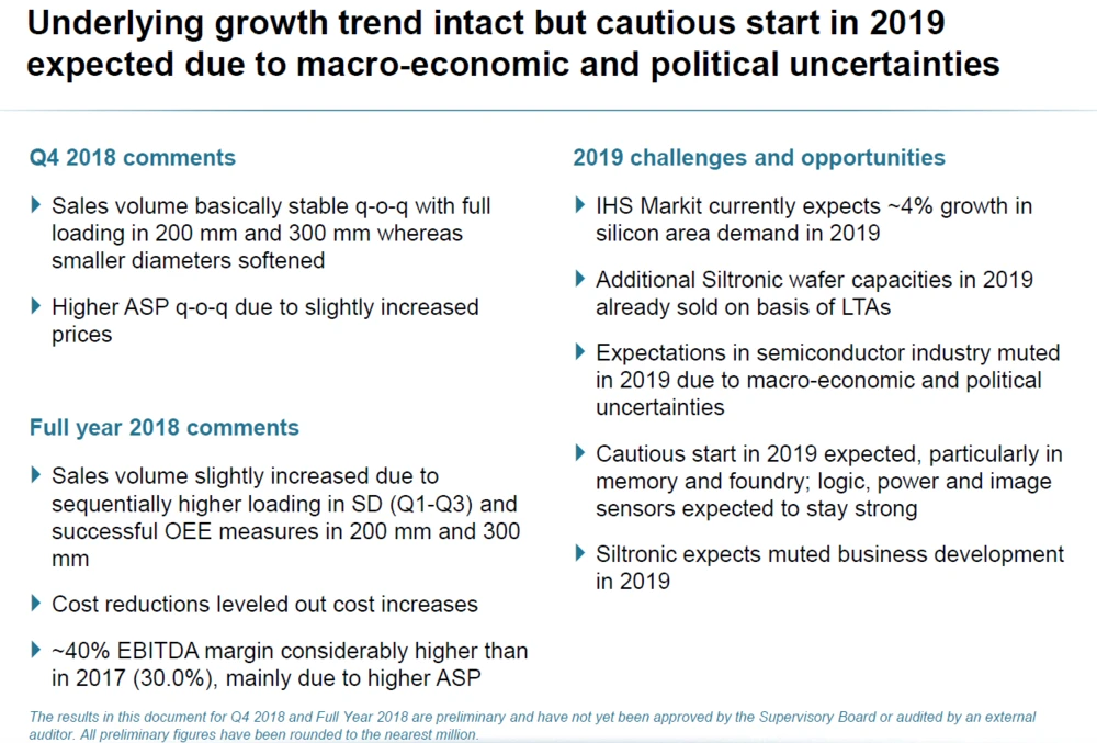 Nach zwei sehr guten Jahren tritt der Vorstand nun aber etwas auf die Euphoriebremse. Die Aussichten im Halbleiterbereich seien aufgrund makroökonomischer und politischer Unsicherheiten für 2019 derzeit verhalten, heißt es aus der Konzernzentrale. Die Nachfrage nach den Wafern für die Halbleiterindustrie liegt – ähnlich wie im Vorjahr – im aktuellen Quartal leicht unter dem vierten im vergangenen Jahr. Der Wachstumstrend bezogen auf die Waferfläche ist dem Vernehmen nach aber intakt.