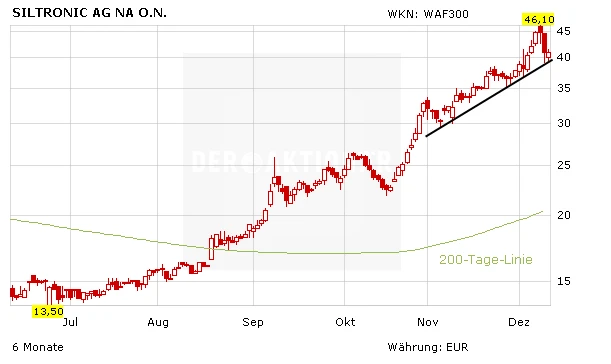 Nach wie vor hält Wacker Chemie den Großteil des TecDAX-Konzerns (rund 58 Prozent) – dies macht Siltronic als Übernahmeziel so attraktiv. Seit dem Sommer dieses Jahres profitiert der Wafer-Produzent von aufkommenden Übernahmegerüchten – rund 200 Prozent legten die Papiere daraufhin zu.