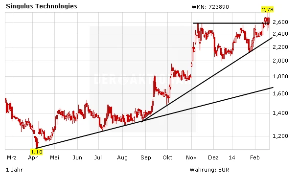 Nach einer monatelangen Seitwärtsbewegung ist die Singulus-Aktie zuletzt auf ein neues 52-Wochen-Hoch ausgebrochen. Mit den Zahlen und dem positiven Ausblick im Rücken dürfte sich der Aufwärtstrend fortsetzen. Charttechnisch wäre Luft bis zur 3-Euro-Marke.