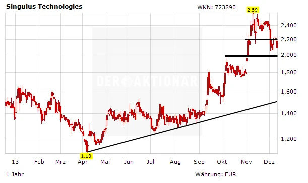 Nach der beeindruckenden Rallye der vergangenen Monate ging der Singulus-Aktie zuletzt die Puste aus. Rutscht der Kurs unter die 2,00-Euro-Marke, drohen weitere Kursverluste. Anleger sollten Vorsicht walten lassen. Erst über 2,20 Euro hellt sich das Bild wieder auf.