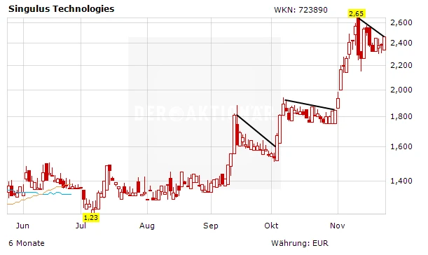 DER AKTIONÄR spekuliert daher unverändert mit einer Trading-Position auf steigende Kurse bei Singulus. Zumal mit dem Überwinden des kurzfristigen Abwärtstrends ein neues Kaufsignal generiert wurde. Gelingt nun auch noch der Sprung über das bisherige Jahreshoch bei 2,65 Euro, wäre der Weg bis zur 3-Euro-Marke geebnet.