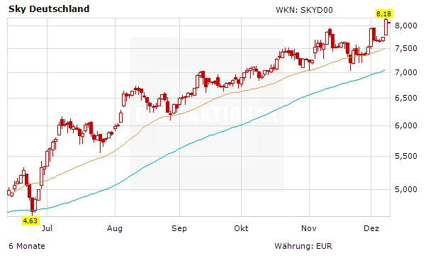 Die DZ Bank hat Sky Deutschland nach dem Erwerb von Senderechten auf „Kaufen“ mit einem fairen Wert von 8,10 Euro belassen. Die Sicherung der Übertragungsrechte für die Champions League für weitere drei Jahre sei eine sehr gute Nachricht, so Analyst Harald Heider. Dies helfe dem Bezahlsender, seine Wettbewerbsposition im Premium-Sportbereich auf absehbare Zeit zu sichern. Er blieb entsprechend bei seiner Kaufempfehlung für die Aktien. Solange Deutschland bis zu vier Mannschaften in die Champions League entsende, sollte auch der positive Einfluss auf die Reichweite des Senders, die sich bereits in dieser Saison zeige, fortsetzen. Diese sei im Jahr 2013/14 um rund zehn Prozent pro Spieltag gestiegen.